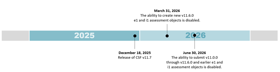 - Effective June 30, 2026, the ability to submit e1 and i1 assessments using CSF v11.6.0 and earlier will be disabled.